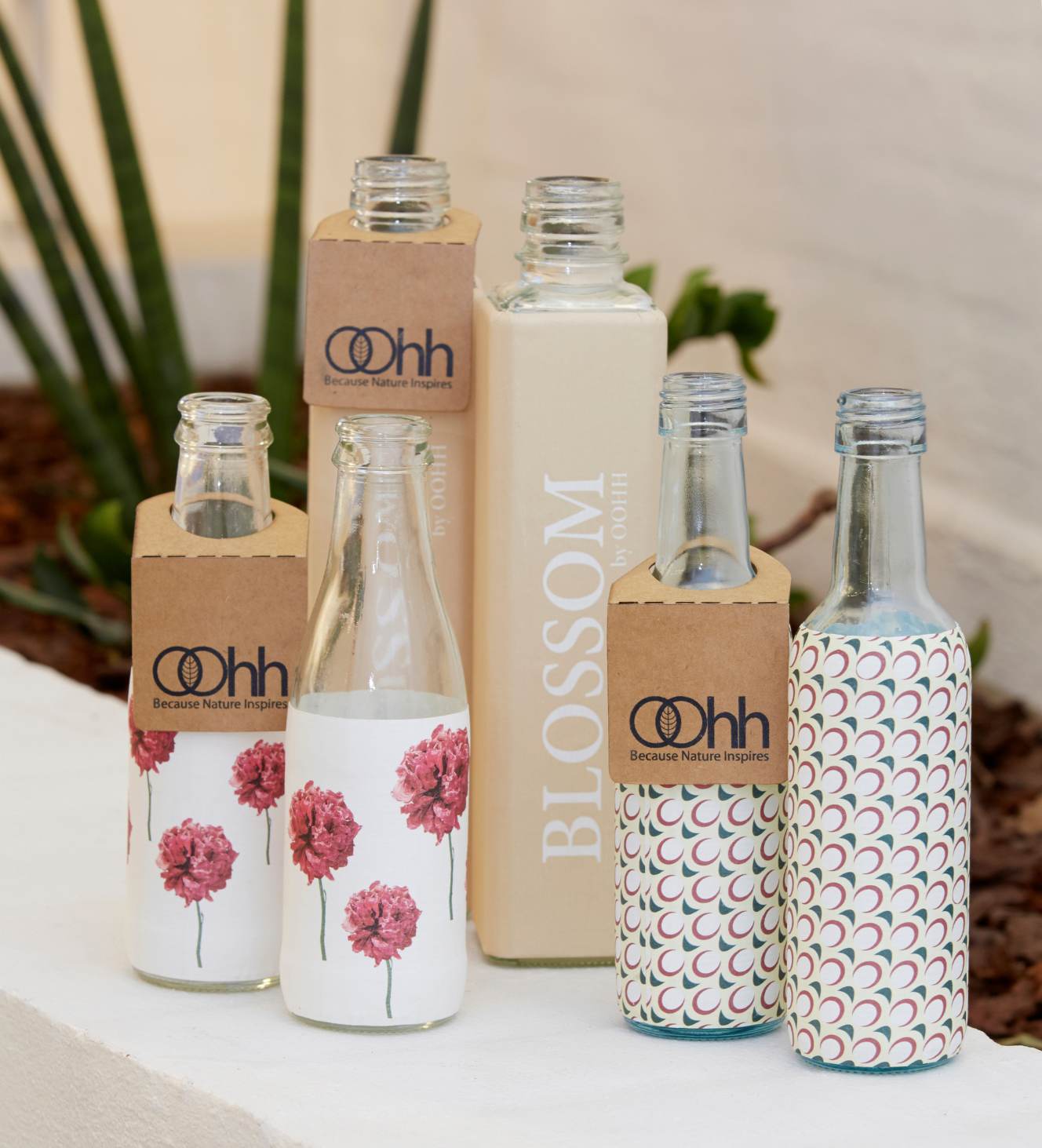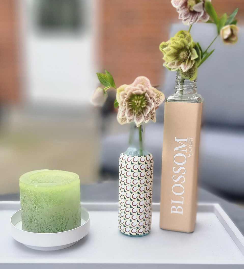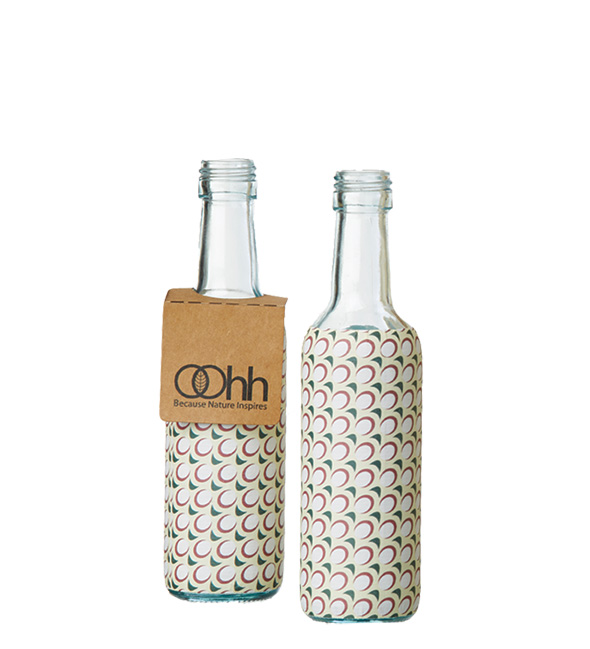 The bottles have previously been used for juice, oils and similar liquids. Now they have been giving af new life with beautiful prints made from recycled paper.